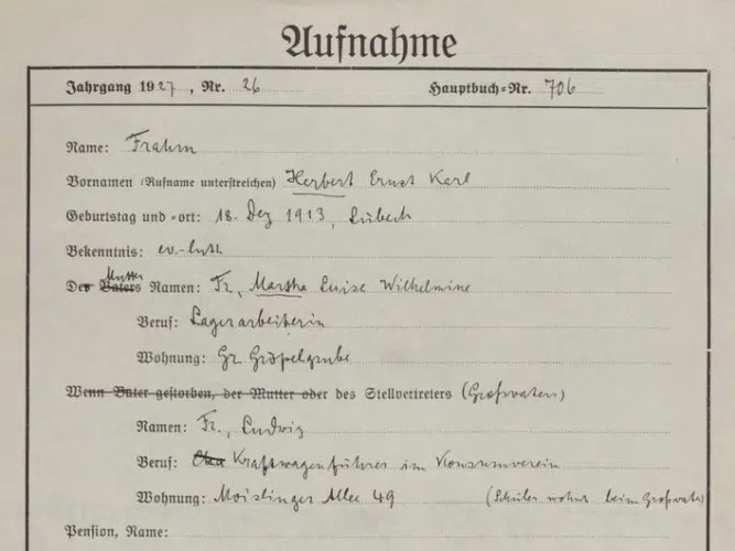 Anmeldung von Herbert Frahm zur Großheimschen Realschule in Lübeck, 5. März 1927