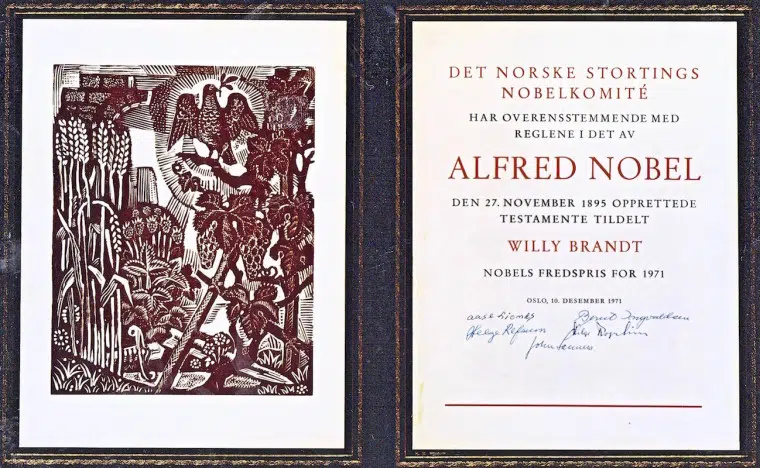 Urkunde zum Friedensnobelpreis für Willy Brandt, verliehen in Oslo am 10. Dezember 1971